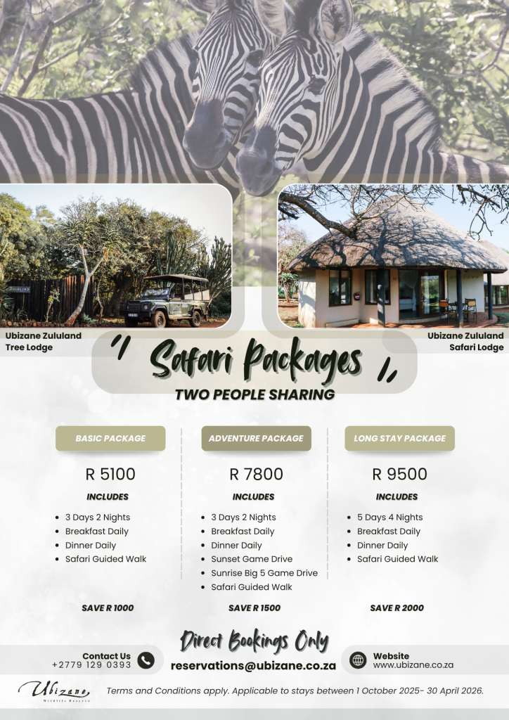 A privately owned, malaria-free zululand bushveld sanctuary spanning 1,200 hectares of breathtaking wilderness. Here, nature thrives, with abundant wildlife including giraffes, wildebeests, zebras, a variety of antelope species, and over 450 bird species. The landscape is nothing short of spectacular, starting with our stunning Fever Tree Woodland and its lush wetlands. From here, visitors can take in the beauty of the natural surroundings, diverse wildlife, and the typical Zululand vegetation. The seasonal Mzinene River meanders through the reserve, adding to the charm of this extraordinary setting. Ubizane Wildlife Reserve is located just 4 kilometers from Hluhluwe Town and is easily accessible via the road leading to Hluhluwe iMfolozi National Park. This prime location makes it the perfect base for exploring the greater St. Lucia World Heritage Site. Plus, we’re only a 2.5-hour drive from Durban’s King Shaka International Airport, making it an easy destination for both local and international visitors. For a truly unforgettable experience, take a guided game drive through our reserve, where you’ll discover the rich heritage and natural grandeur of northern KwaZulu-Natal. Enjoy morning drives to Hluhluwe-iMfolozi in search of the Big Five, or sunset safaris around Ubizane Wildlife Reserve, where you’ll encounter herds of zebra, giraffe, duiker, a variety of antelope, and abundant birdlife. Our knowledgeable and passionate game rangers ensure each drive is not only thrilling but also educational.
